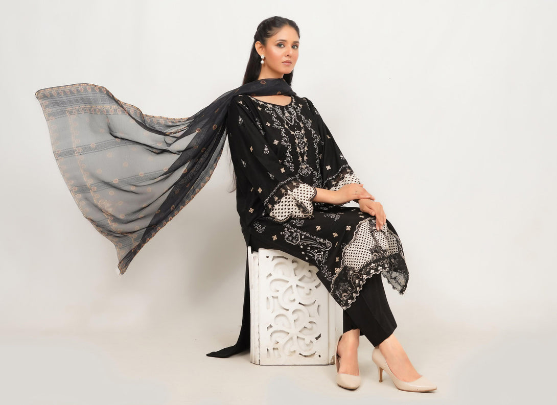 Embrace effortless elegance with this black embroidered lawn ensemble by Nimra B Summer Collection. Designed with breathable, lightweight fabric, this outfit brings together comfort and sophistication—perfect for the warmer season.